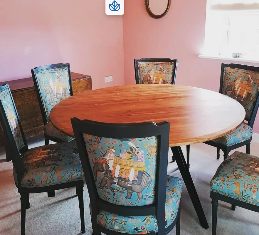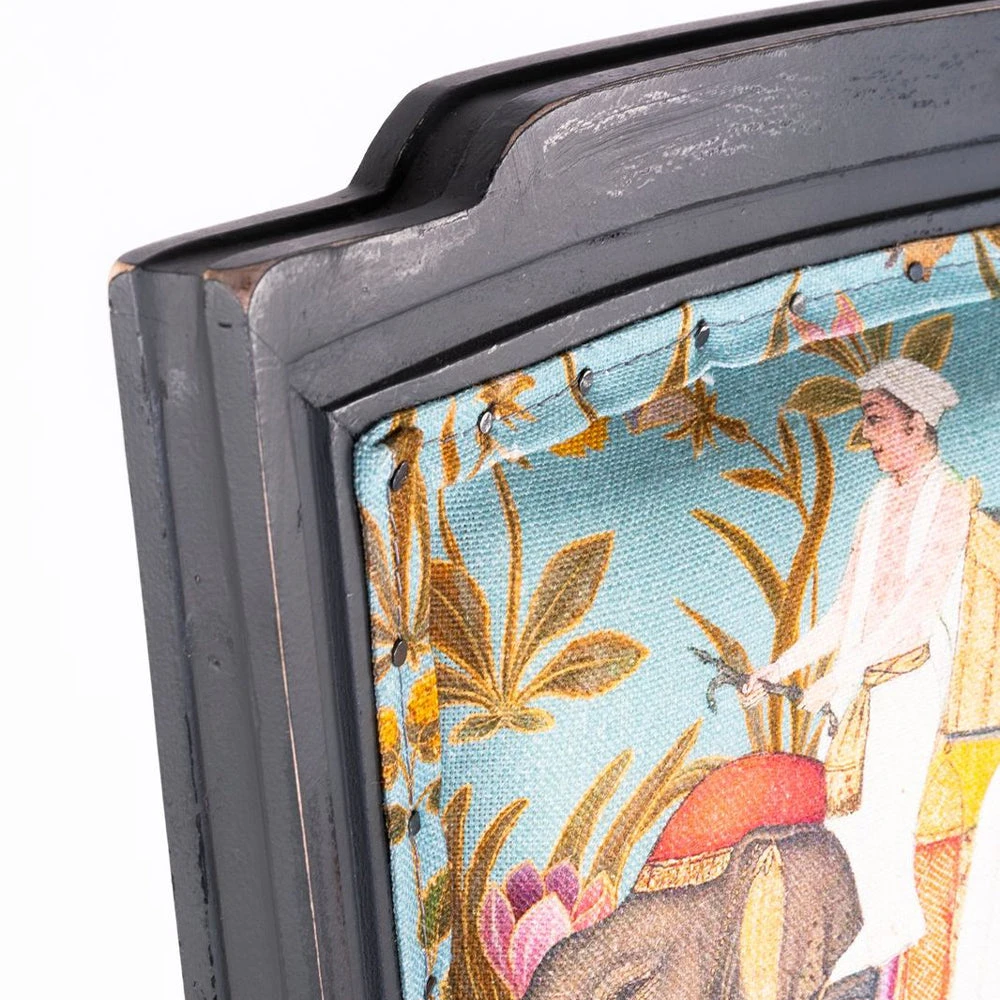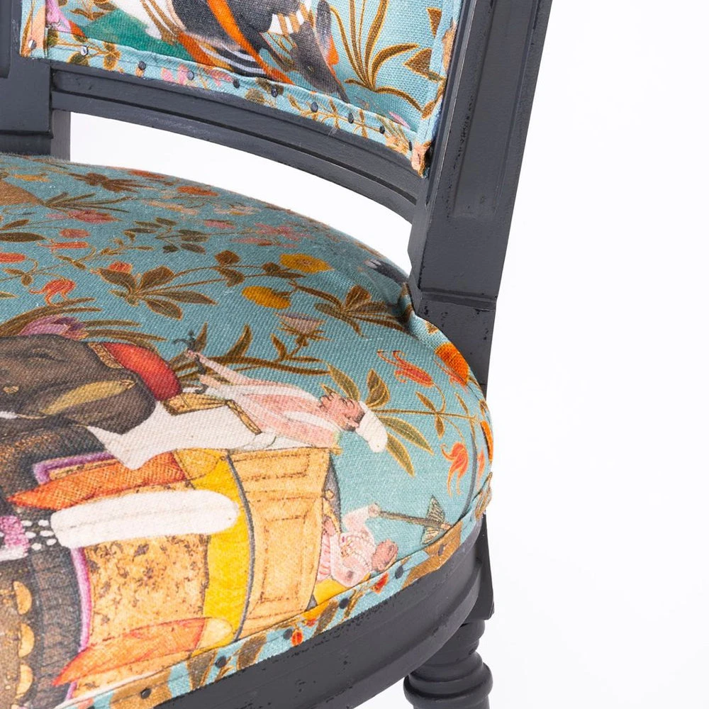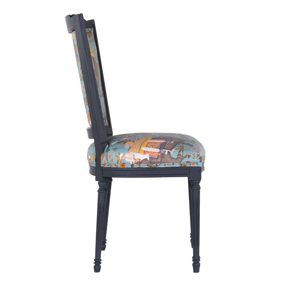 Mind the Gap’s collection of whimsical fabrics continues into this eclectic offering of furniture. A Neo-classic style dining chair upholstered in the green option of HINDUSTAN AQUAMARINE Linen. Shaped with a slightly curved back and pointed wing tips, finished with decorated turned legs in a distressed paint.Â