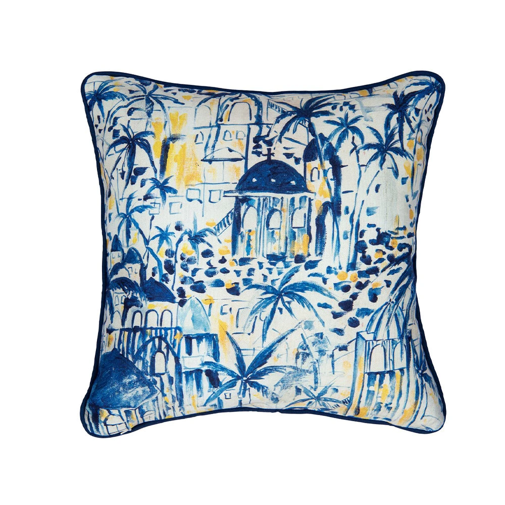 Summer vibes come through the stylish palm trees and sandy details of this charming design that creates our RHODES stonewashed cotton cushion. Finished with indigo piping and decorated with an embroidered maritime crest on the lower right corner. Complete with filling made of natural feathers. Linens are stonewashed finished for softness and vintage effect.Â