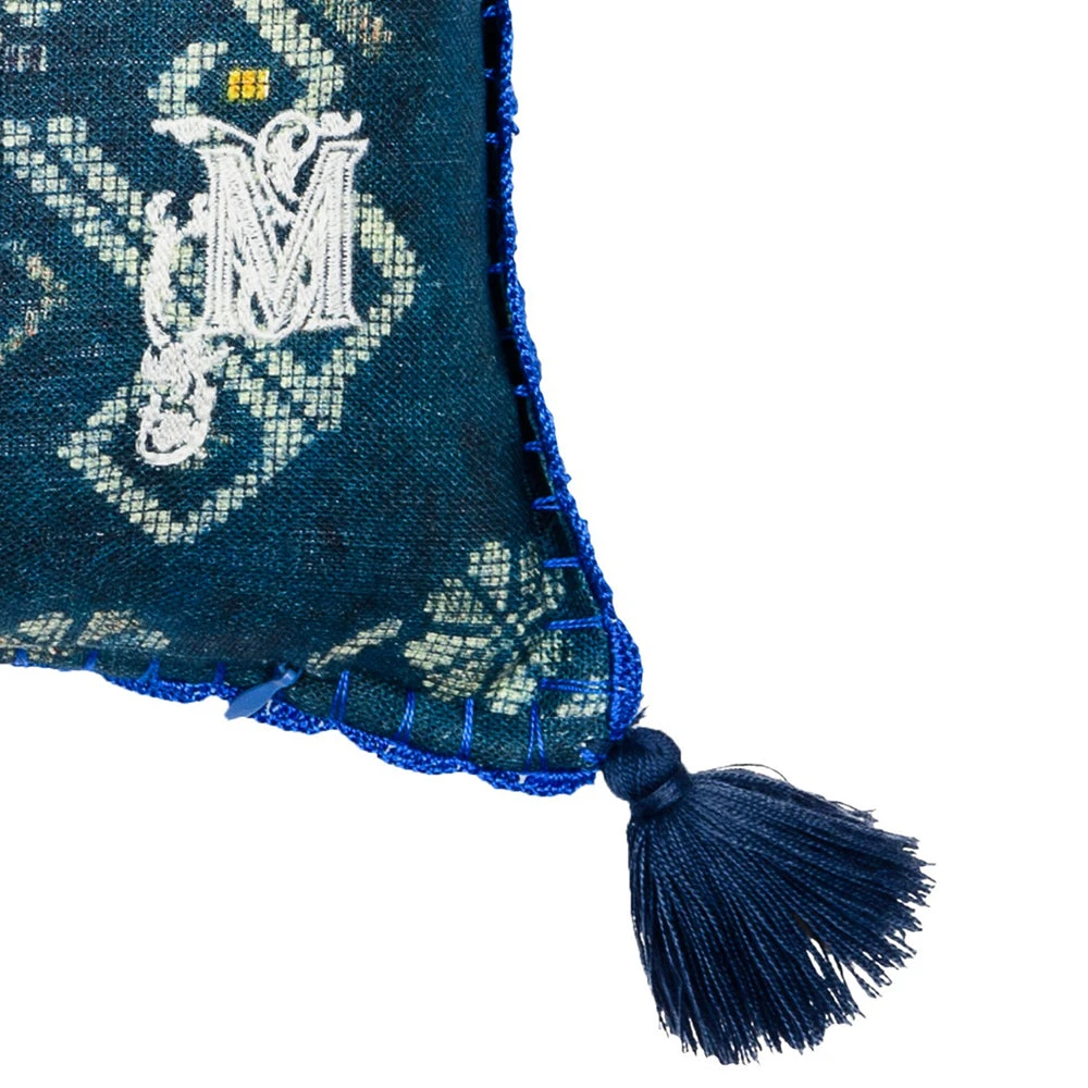 Nobel blue of Hungarian origins blended with crafted geometric details. Deep shades of blue pattern on both sides and ‘M’ monogram on the back. Finished with blue scalloped crochet trim and blue cotton tassels. Â