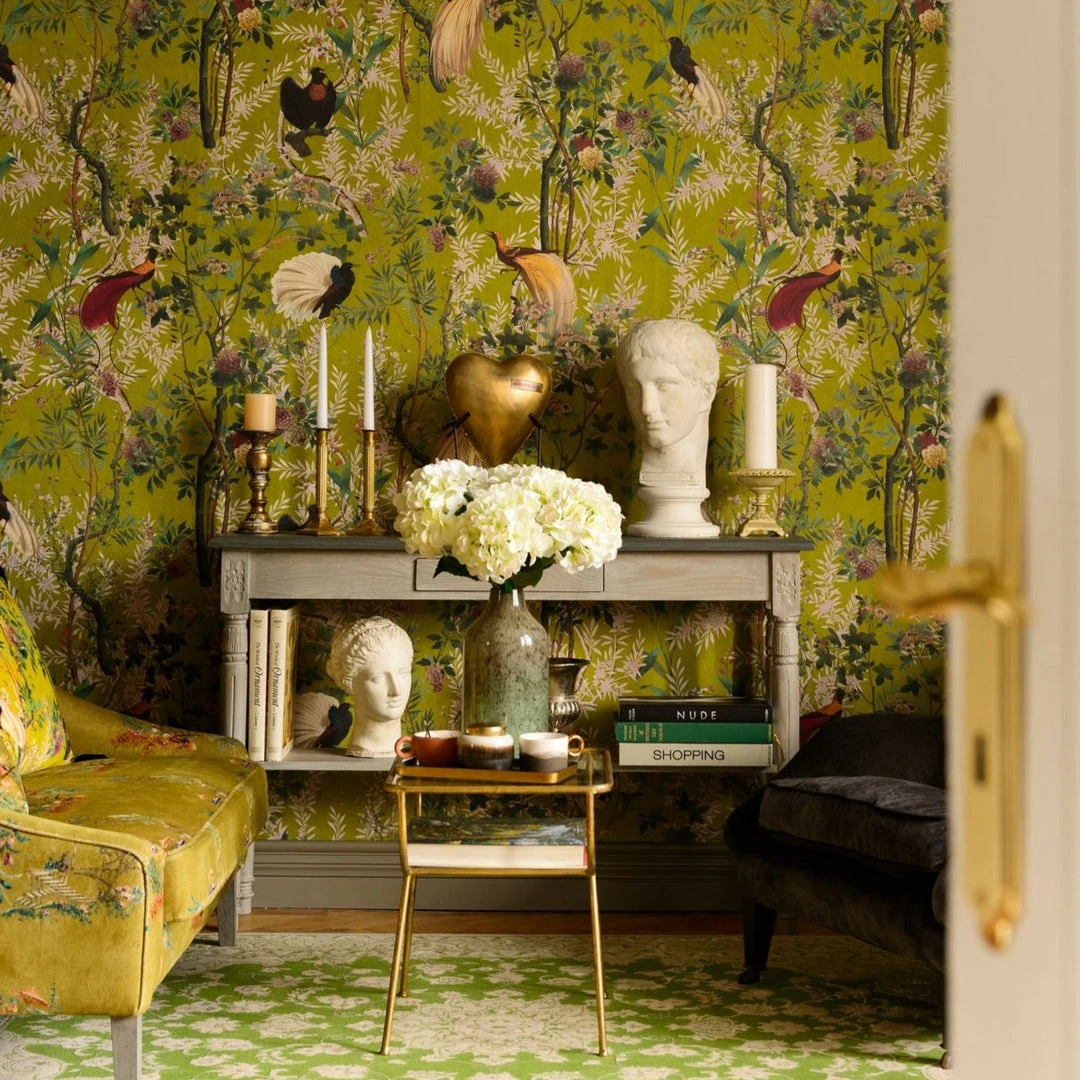 Adorn your walls with the beautiful Royal Garden Green wallpaper from Mind The Gap. An enchanting and whimsical wallpaper full of intricate birds and rich foliage, perfect for making a luxurious and impactful feature in any home. Easy to put up with the paste the wall application and will enhance any room whether it is one wall or all. This wallpaper is digitally printed using eco-friendly inks. Printed across three rolls to maximise the repeat pattern.Â