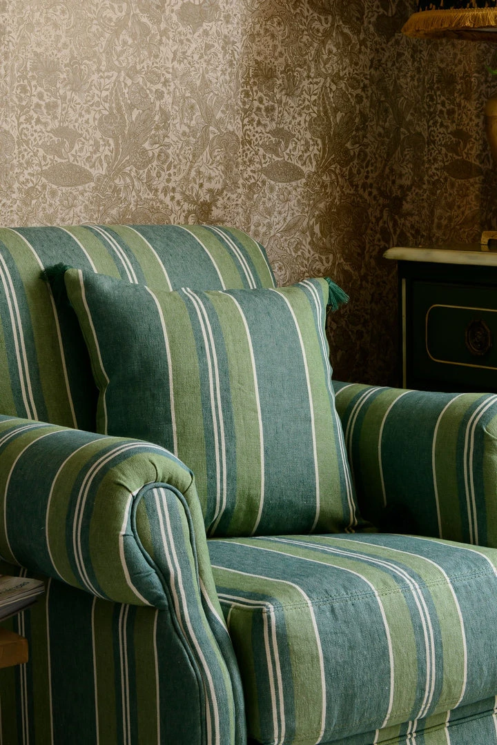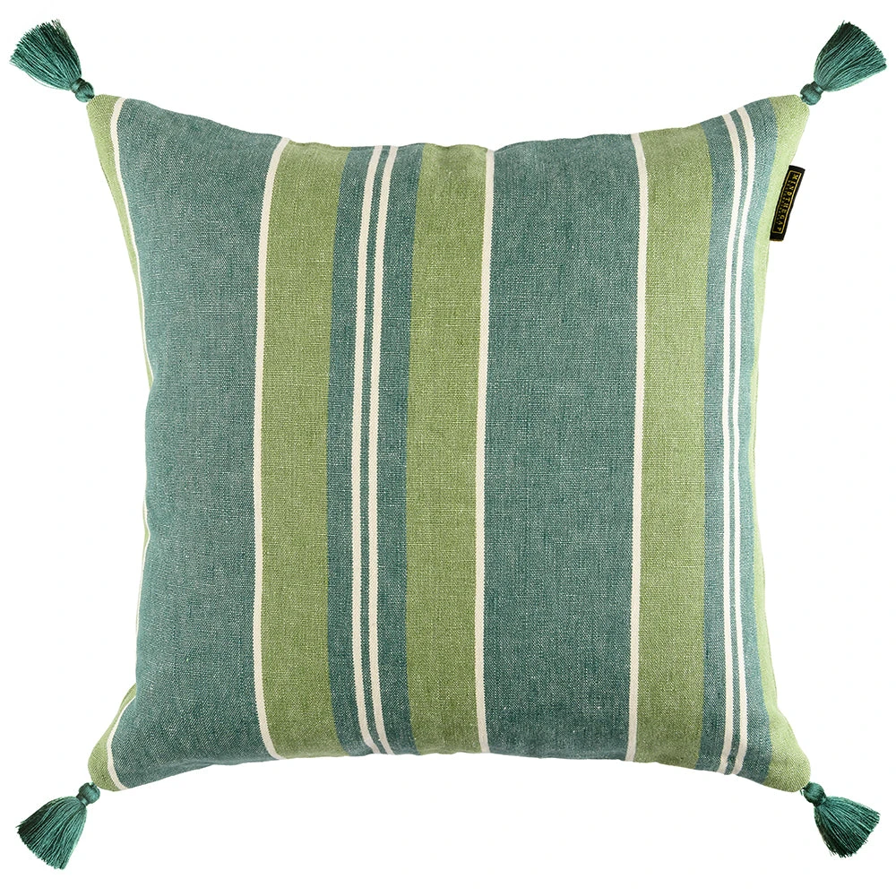 Deep Armenian roots shown in the various green shades of this striped linen cushion. Pattern on both sides and with ‘M’ monogram on the back. Hand finished with green cotton tassels.