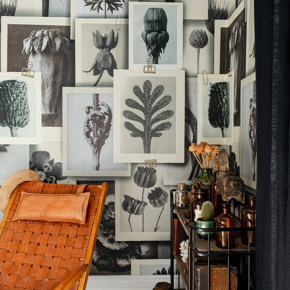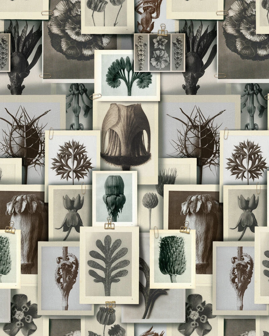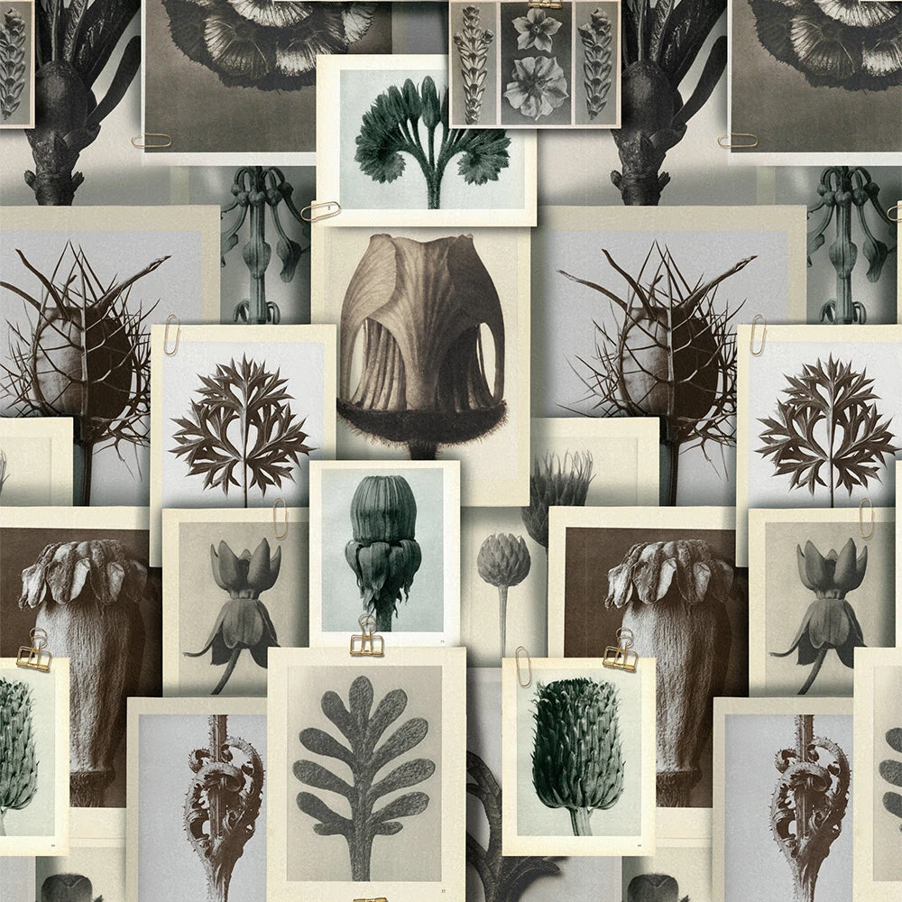 Re-enter a world of sketching, collecting and displaying, where inspiration comes from all around, pieces of paper dominate, drawings smell like begone school days and neat gold clips keep it all in place. The taupe, grey and beige hues of BLOSSFELDT’S ART FORMS welcomes you into a realm of discovery, where delving into plant specimens and botany is akin to adventure. Hand illustrated leaves, stems, buds and petals are artfully magnified, highlighting their evocative, sculptural forms and reminding us that there’s a whole universe of nature out there to explore and reimagine. The design is printed over 3 panels.