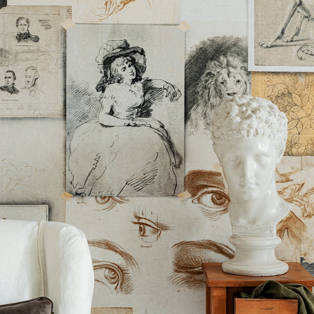 Surround yourself with beautiful drawings and illustrations with The Mood Board wallpaper from Mind The Gap. Perfect for adding daily inspiration to get your creative juices flowing, this delicate design would look beautiful in a range of spaces. Printed across three panels to maximise the pattern repeat.Β