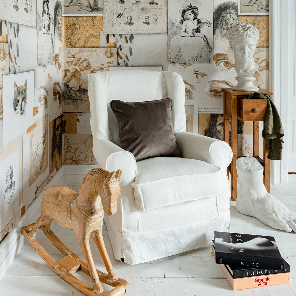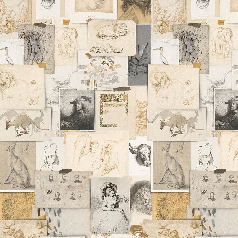 MOOD BOARD celebrates the joy in recording, collecting and displaying that which inspires and captivates you. Pinterest, be gone β here we delight in the physical act of sketching, cutting and sticking, with the pattern echoing the tactility of paper affixed to the wall. Hand drawn studies of figures, flora and fauna, details and drawing techniques are recognised for their expressive, decorative qualities and combined into a beguiling design full of life and narrative, in gentle monochromes and the sepia tones of time-aged paper and tape. The design is printed over 3 panels.