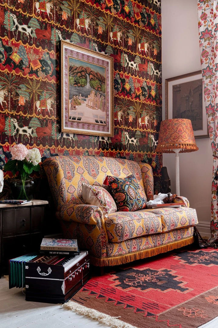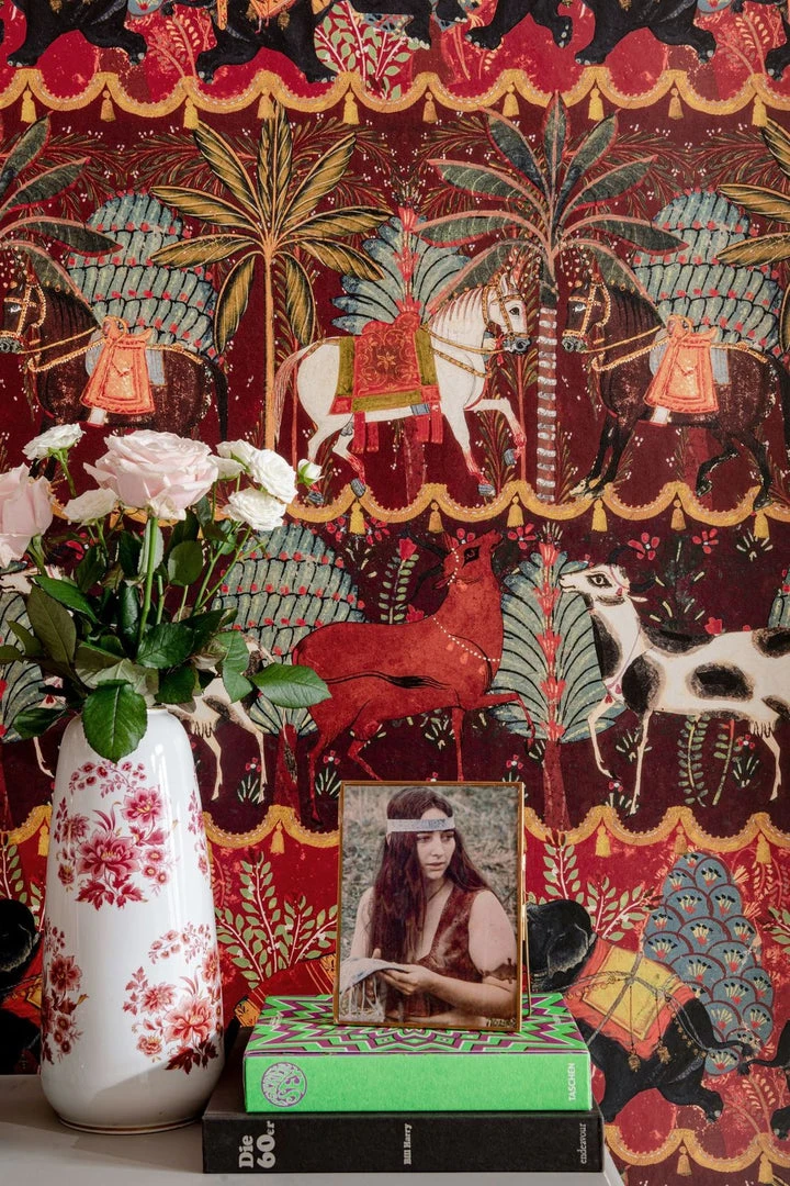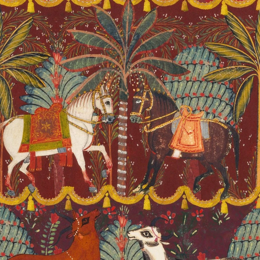 Embrace the CARNAVAL spirit with horses, cattle and elephants adorned with decorative garlands and embroidered tapestries. Lose yourself amongst exotic foliage and vivid florals while the sound of music fills the air which even the animals are dancing to. The vibrant colour combinations across the print bring it to life, bordered by tasseled, golden garlands which allow the eye and mind to transition between the settings, imagining the different scents which encapsulate you, as you wander through the magical gardens in each scene.