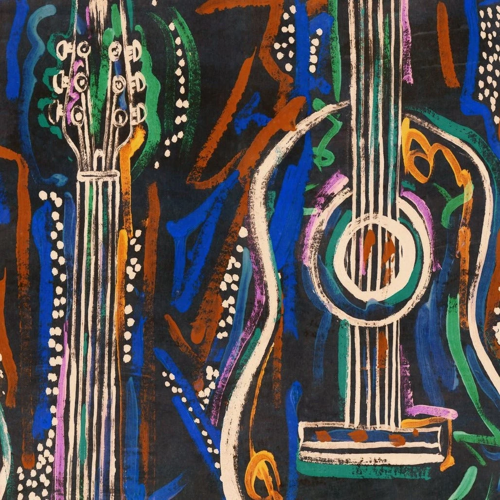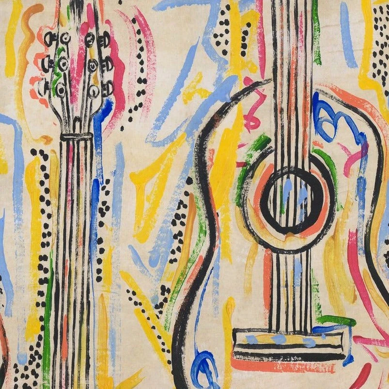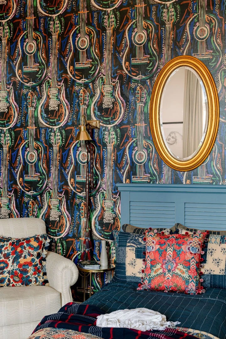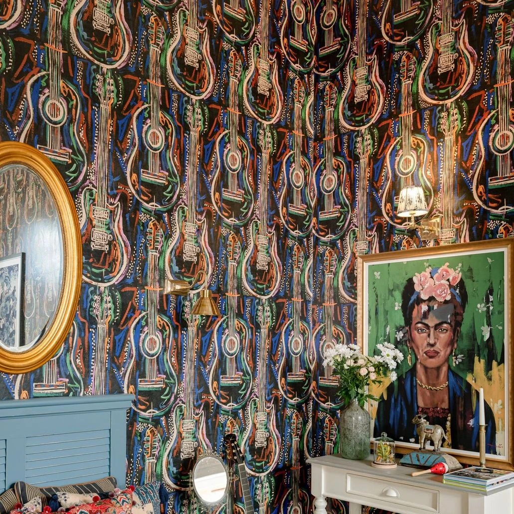 Woodstock was all about the music and behind the music lies the magic of the instrument. The HARMONY wallpaper celebrates the form and beauty of the guitar, set amongst swirling abstract lines in psychedelic colours which emulate the dreamlike atmosphere of the festival itself. Get lost in the sounds of acoustic and electric guitars, playing riffs, or strumming chords to the rhythm of the song which fills the room. Dream of your favourite music genre and let the guitars take you there as they stand out across both white and black backdrops.