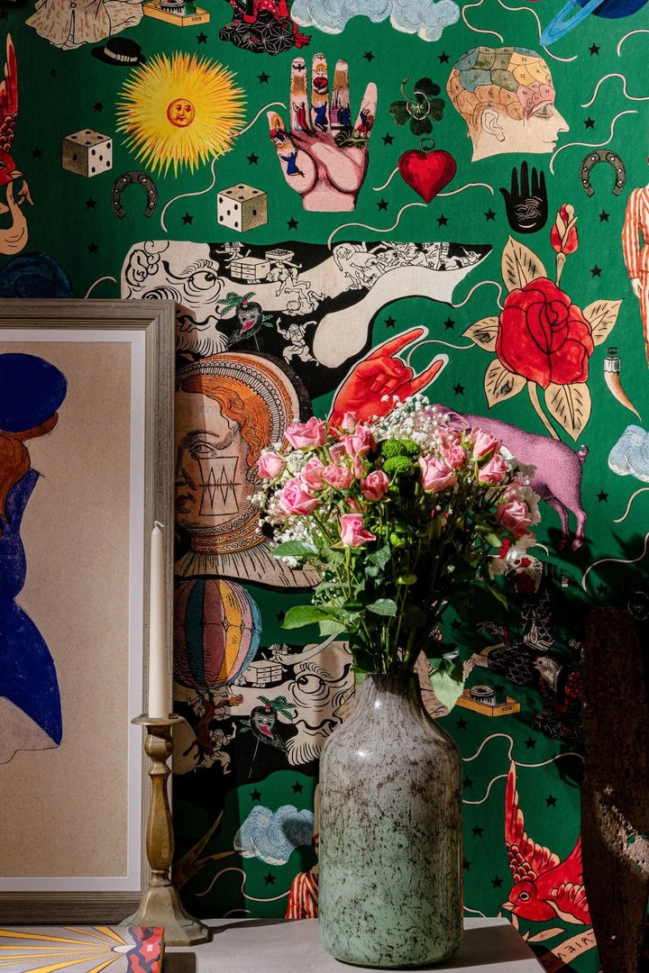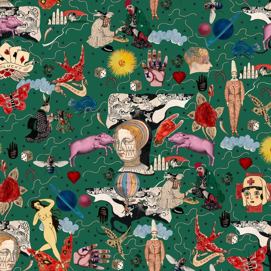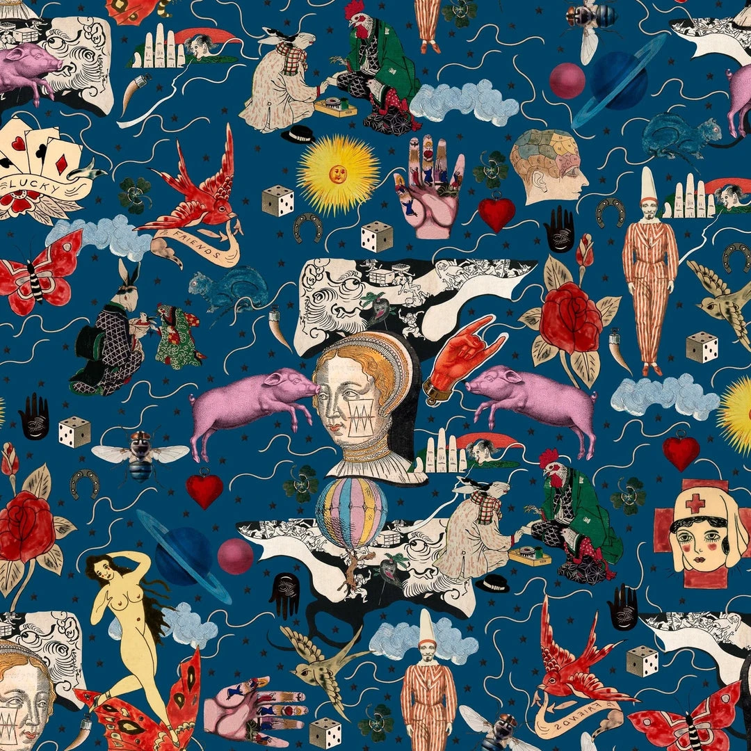 Absorb yourself in a world of magic, and optical illusions, where the boundaries of reality become blurred. Let your imagination take you to another realm where pigs fly, animals play games and lucky charms are there for the taking. Above the stars, the clouds, and the solar system, lies this ILLUSIONARY DAYTIME. One where you can escape to, from reality as you know it. One where magic is actuality, broadening your horizon and letting your sense of wonder take over in this dreamlike sphere set against blue and green backgrounds.