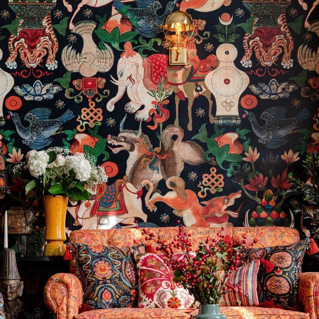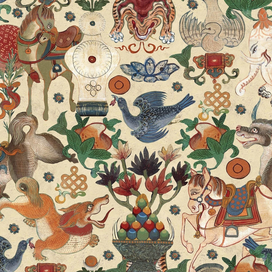 Expect the unexpected in the mystical world of INCANTATION. Where creatures roam freely through an enchanted setting, stay alert as you never know what lies around the corner. Exotic birdlife, ornamented horses and mythical dragon-like animals will surround you, as you wander through gardens filled with striking florae and intricate architectural figures. With backdrops of cream, dark blue and yellow, this vivacious print opens your senses as you imagine a rich, aromatic scent flowing through the air in this fascinating and captivating domain.