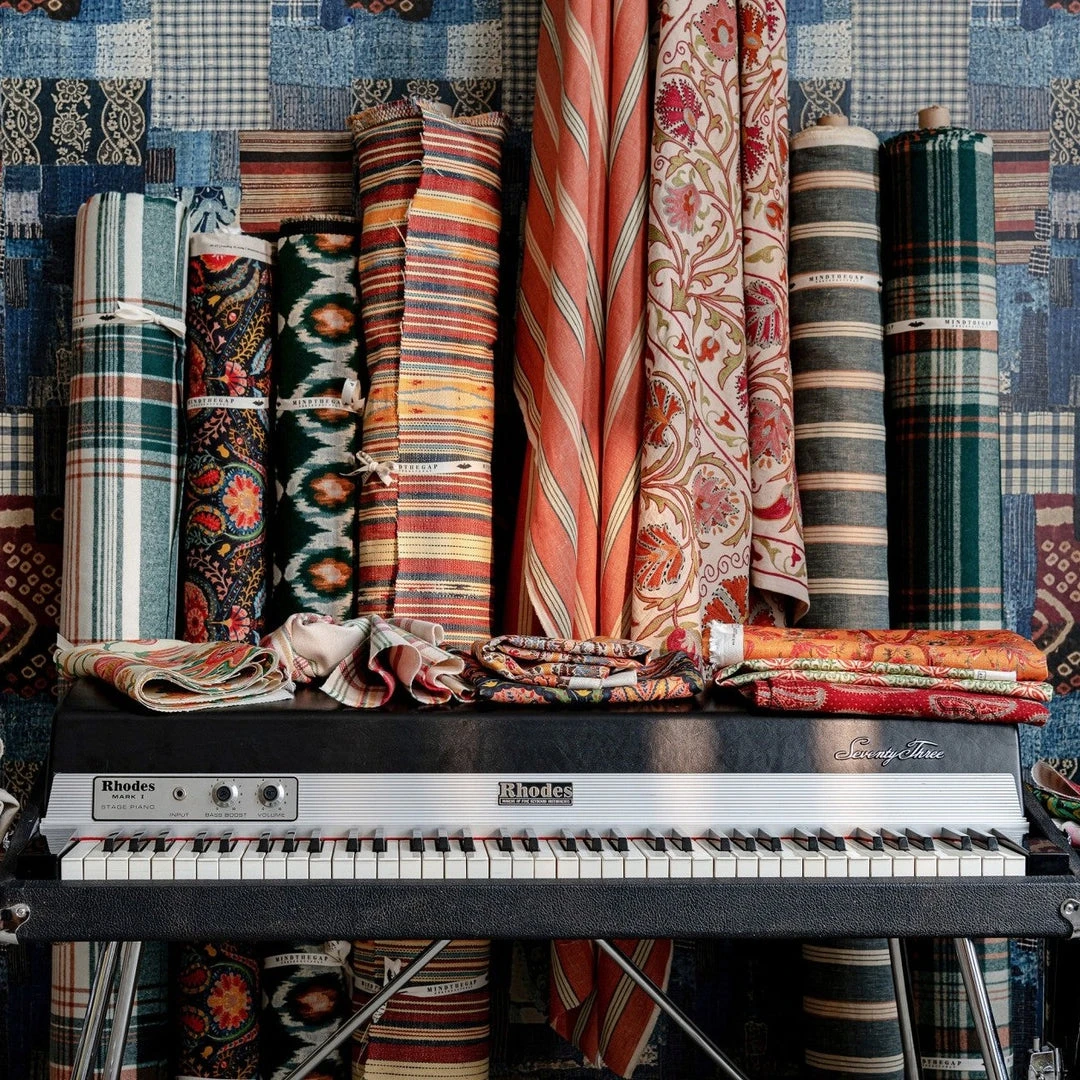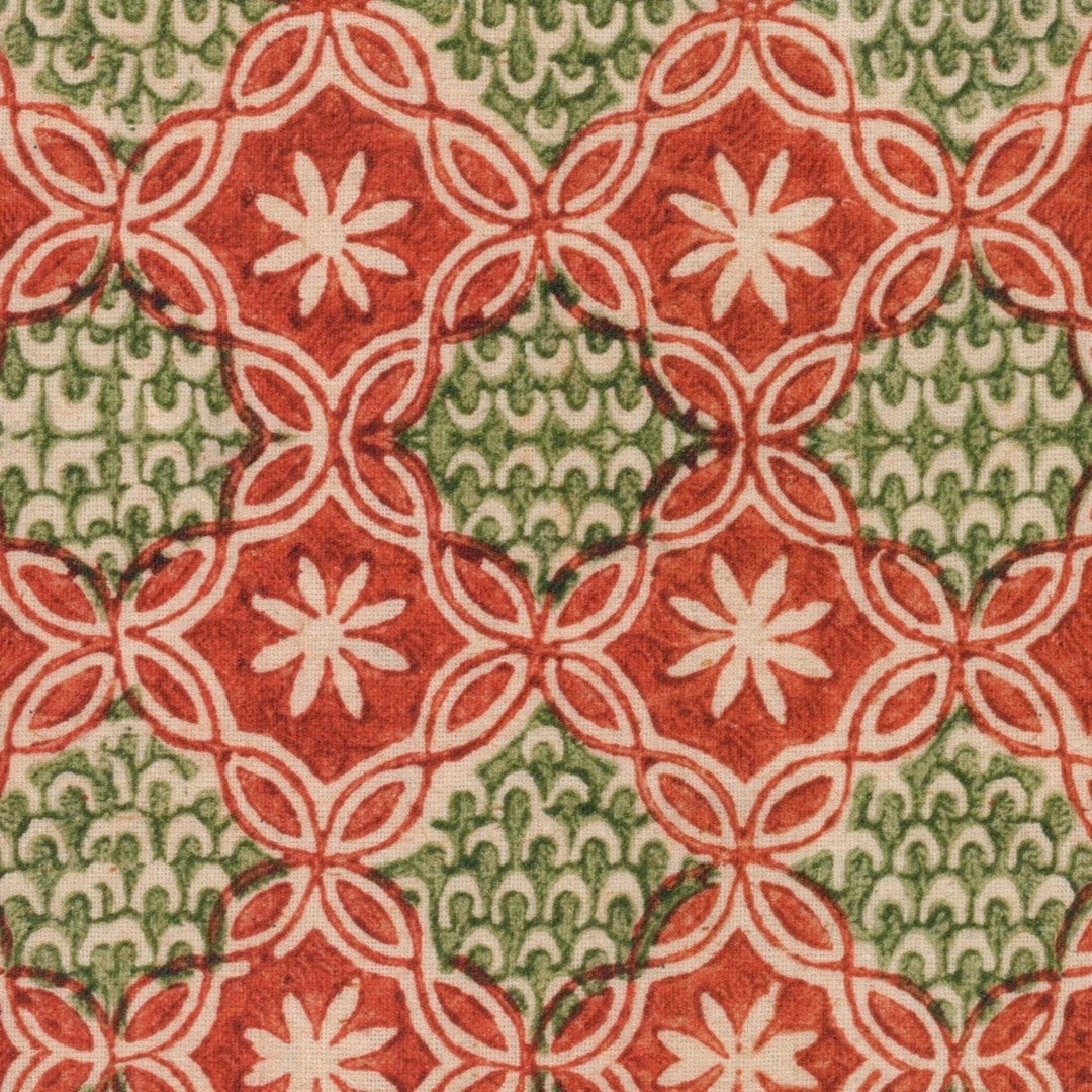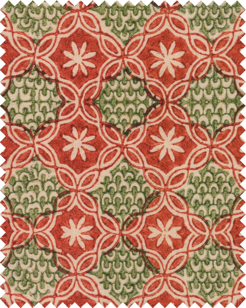 Referencing Indian folk music through its bright colours and intricate patterns, RASIYA brings a playfully elegant touch to the home. The delicate patterns entwine with each other, resembling floral-inspired motifs set against a pastel green backdrop which allows the terracotta red tones to beautifully stand out. Trellis design of red, Green and Taupe.