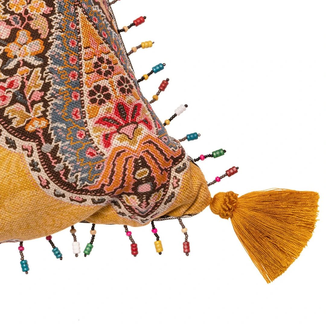 Exuding the vibrancy of the Woodstock era and the festival atmosphere, this printed linen GYPSY SOUL cushion will lift your spirits bringing a joy to the home. Complete with matching corner trimmings, the cushion also has smaller multi-coloured beaded tassels creating a unique fringe detail. The large floral motifs add texture to the design, set on a mustard fabric backdrop containing a subtle monochromatic decoration.