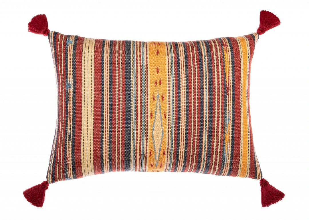 A vibrant and colourful design with varying vertical stripes and a central motif drawing the eye across the assortment of line patterns and hues. NEYSHABOUR embodies the spirit of Woodstock with its rich palette and confident colour combinations while the woven texture adds a soft touch to the design. The four red cotton tassels give the cushion a refined silhouette while the duck feather filling complements it.
