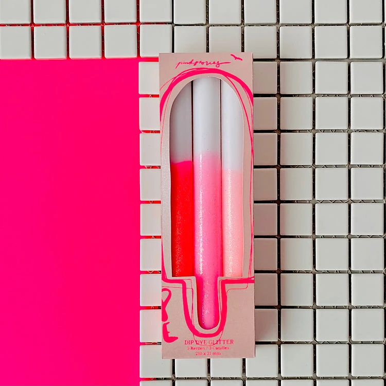 This boxed set of x 3 taper candles will satisfy all your retro day glow dreams. Now with added glitter sparkle for maximum glam. A fun way to brighten up your table setting and a most unique, fun gift item.Â