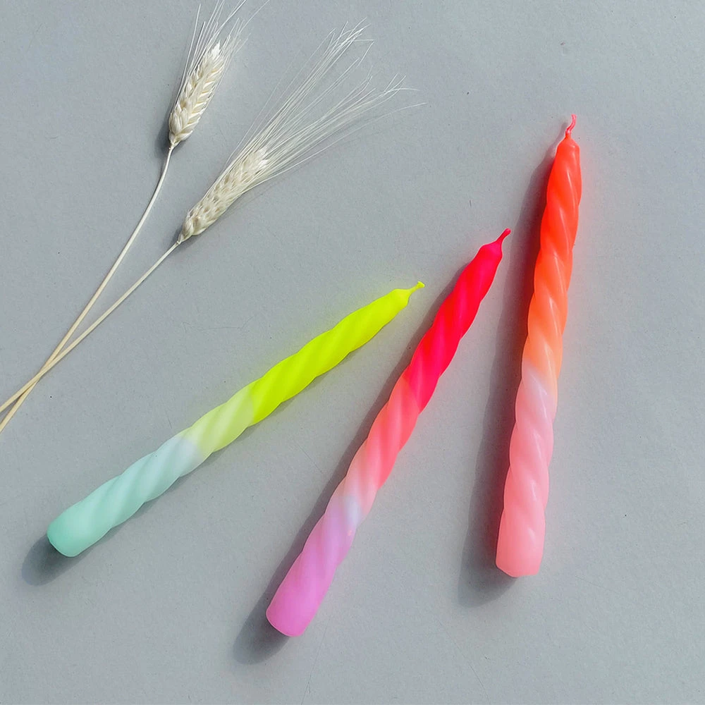 This boxed set of x 3 twisted candles will satisfy all your retro day glow dreams. A fun way to brighten up your table setting and a most unique, fun gift item.Â