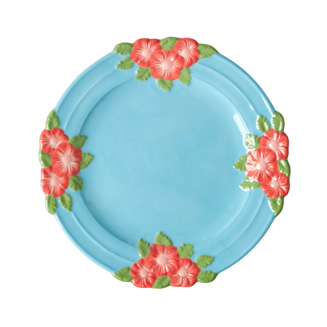 - Elevate your dining table with the Rice By Rice Ceramic Floral Side Plate in Blue. Featuring a delicate floral design, this plate adds a touch of elegance to any meal or occasion.