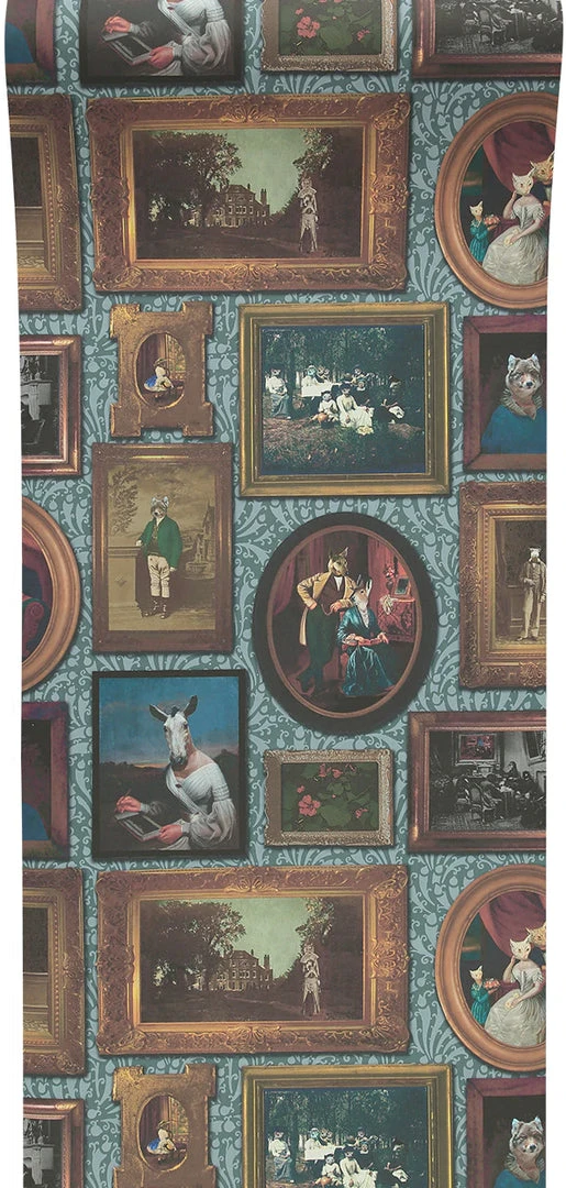The Art Gallery wallpaper contains an original 19th century background wallpaper combined with original works of art by Charlotte in a collection of decorative frames, all gathered in the most eclectic family portraits walls. A wonderful and whimsical way of showcasing paintings by this gifted artist.  Â