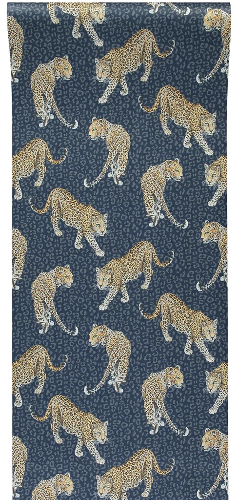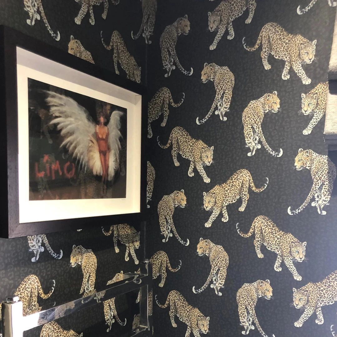 A striking wallpaper design from Abi Bartlett of hand painted leopards prowling across a tonal skin background. Indulgent, glamourous and dramatic. Â