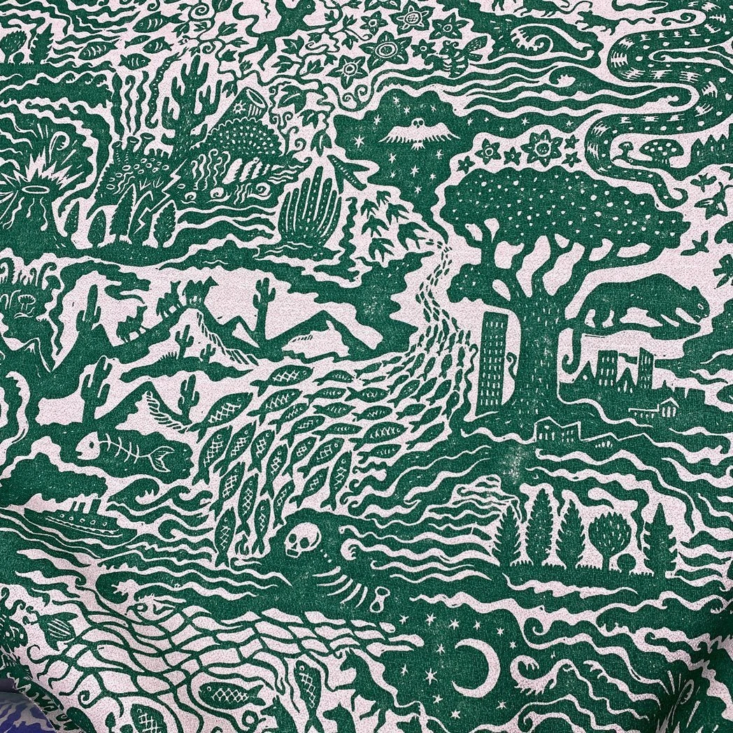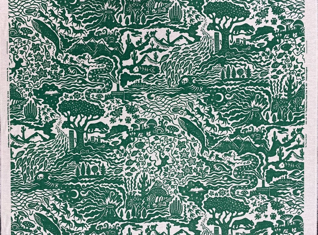 The Monkey Puzzle Tree collaborated with Alexis Snell, who specialises in lino cut prints. This print subtly pushes a message about humankind’s impact on the planet and explores the juxtaposition between the natural and industrial world. Flocks of swallows morph into aeroplanes and factory fumes mingle with skulls and snakes.Â