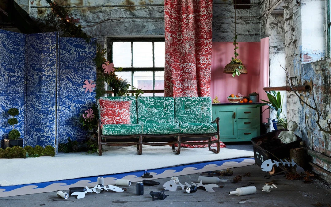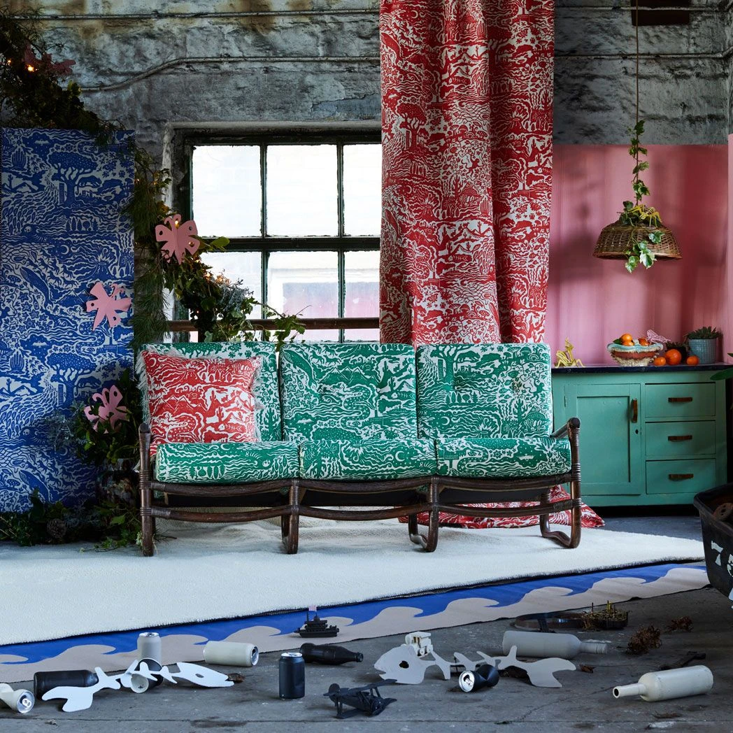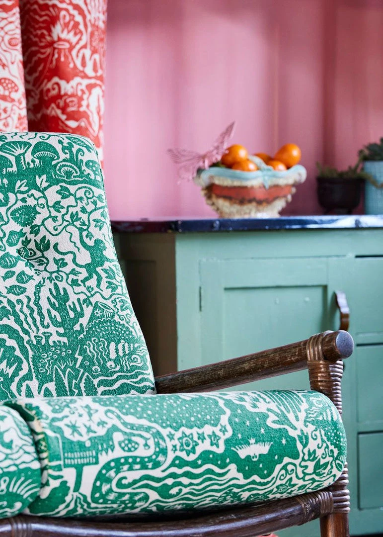 Alexis sketched the design, before hand-carving into lino block which was printed by hand. This pattern was then screen-printed onto bespoke cotton-linen fabric a heritage mill in Cumbria.Â