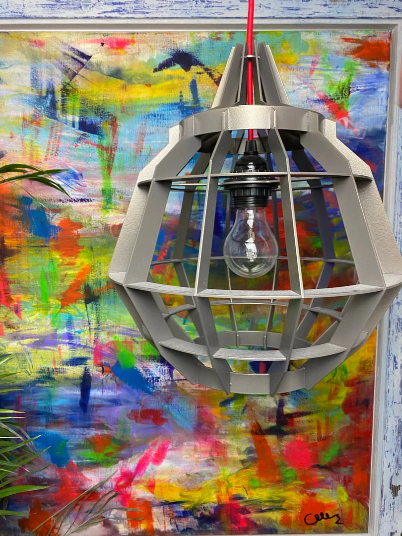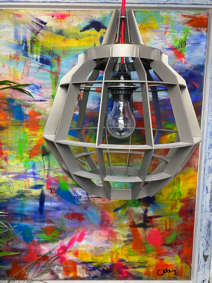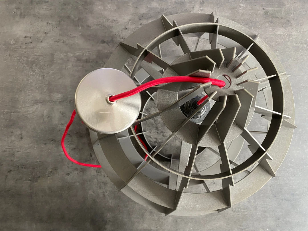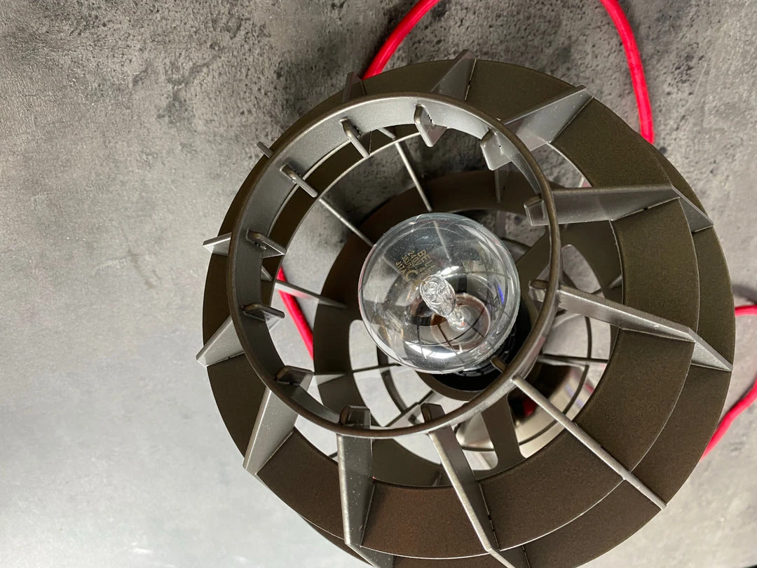 A skeletal form orb shaped light with electrical cable and ceiling rose.