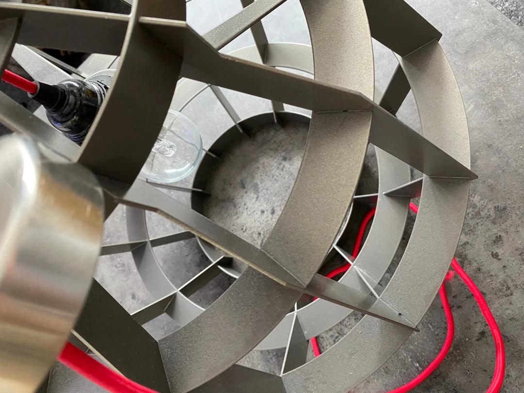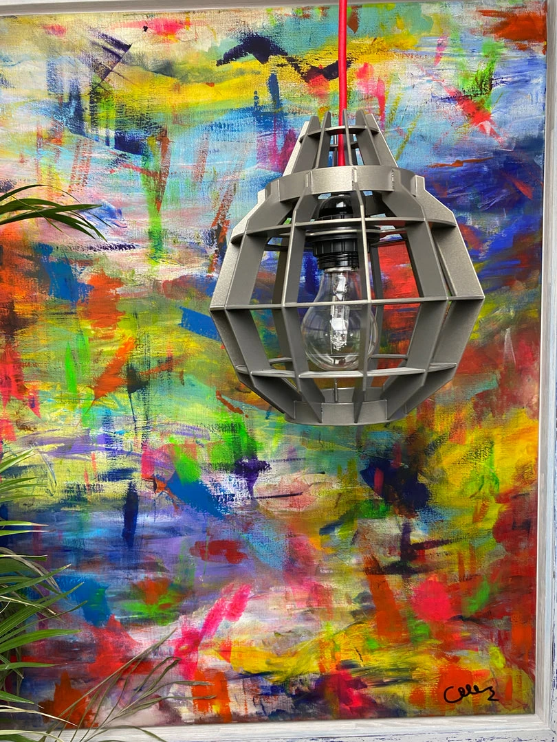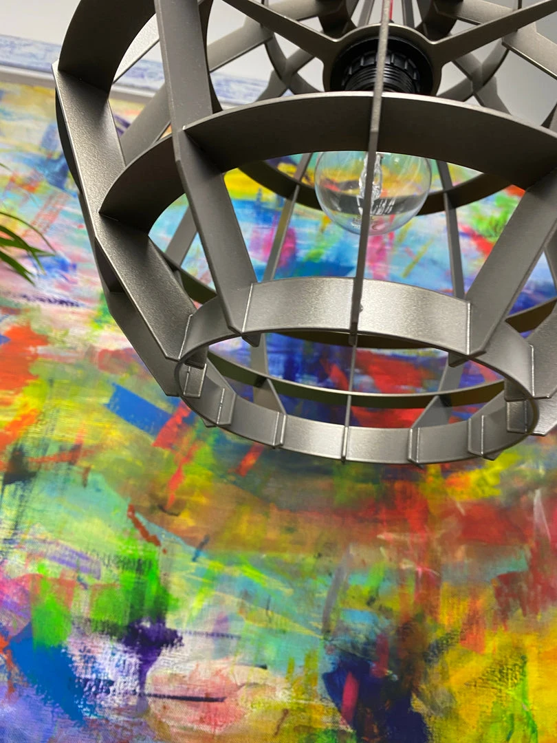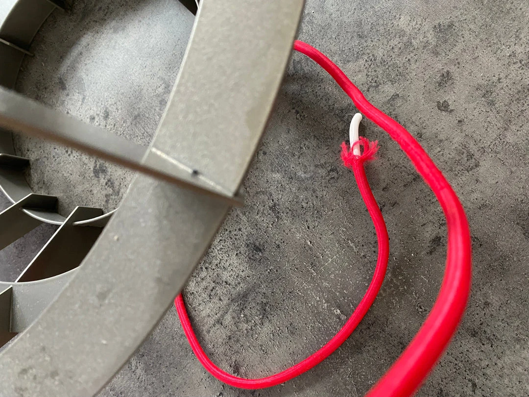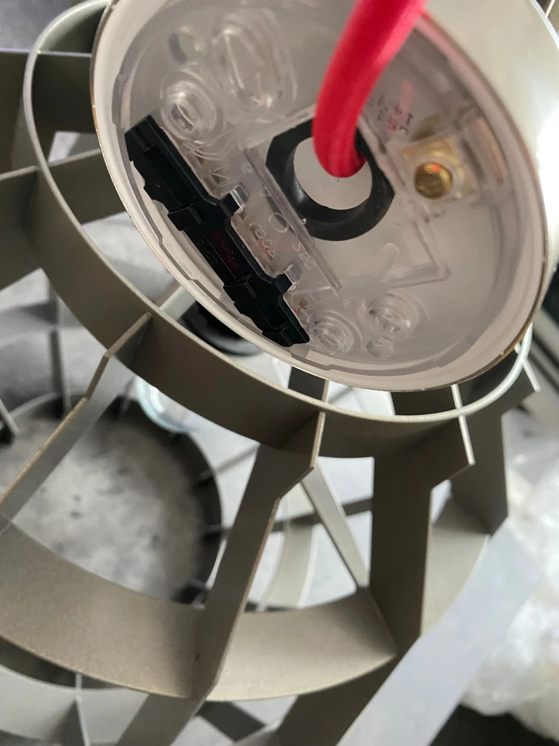 A skeletal form orb shaped light with electrical cable and ceiling rose.